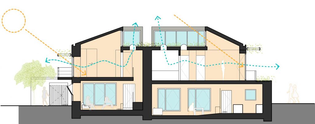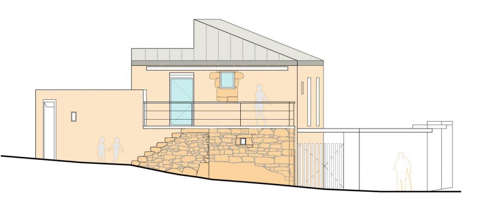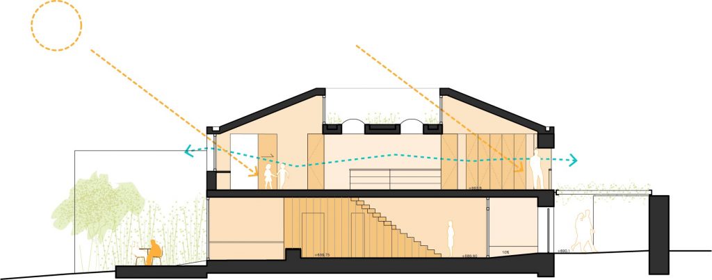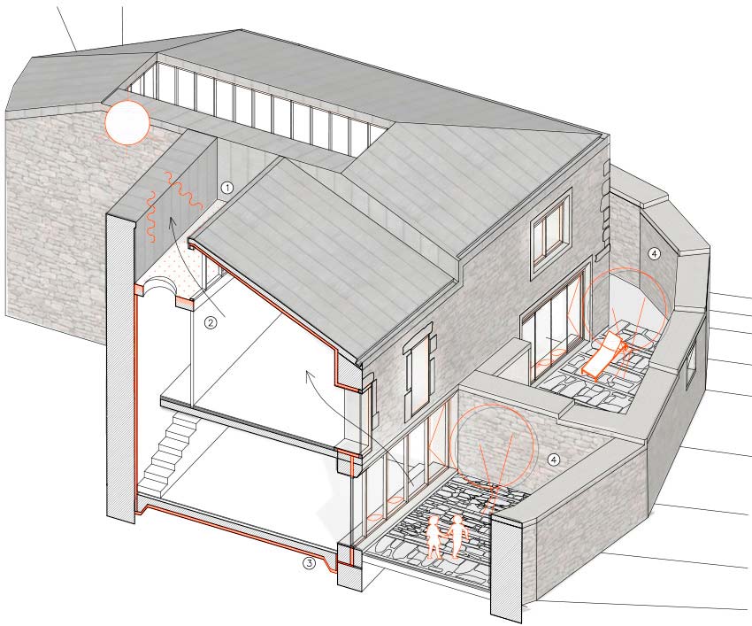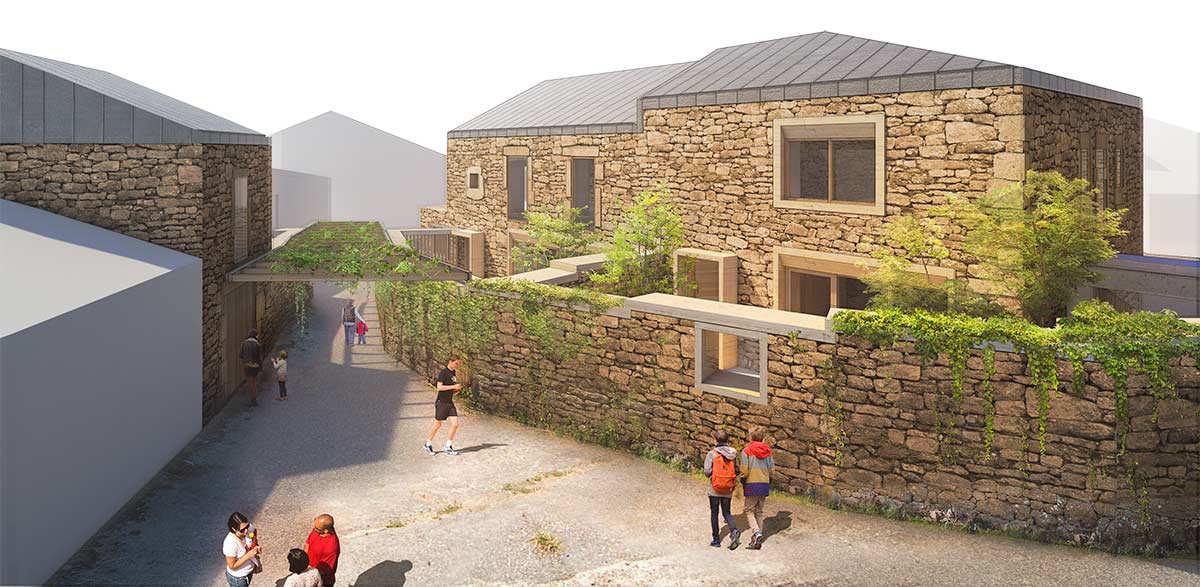 Se propone, a su vez, la renovación de la arquitectura tradicional gallega incorporando en ella valores de la arquitectura sostenible, a saber: se proponen una cubiertas ligeras y eficientes, que manteniendo el característico perfil de las construcciones vernáculas pero descargadas ya del peso de la tradición, aprovecharán la inclinación de sus faldones para permitir la iluminación y ventilación cruzada de las estancias superiores y el aprovechamiento de la energía solar para la producción de agua caliente y energía.